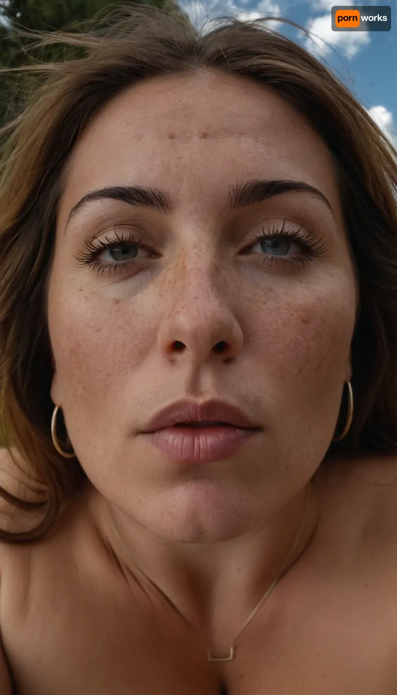 Photo taken vertically upwards, An insanely hot 40 year old italian milf is covering his field of view, her mouth is orgasming, her eyes are halfway closed, glasses, (freckles and tan-lines:1.1), blue sky with small white clouds are seen far above her head, her extremely long hair is falling down on viewers face and covering his entire pov, her very long and beautiful hair is hanging down right towards viewer, her hair is almost touching viewer, photo from lowest angle, (photo taken vertically upwards:1.3), her boobs and face in picture, photo taken with a fish-eye 180 degree wide lens, (sagging tits:1.2), (her heavy and long tits stretched all the way down to viewer:1.3), (very long hanging and sagging titties:1.4), (extremely big areolas and nipples:1.3), long and messy messy chestnut hair, loose wide-necked t-shirt