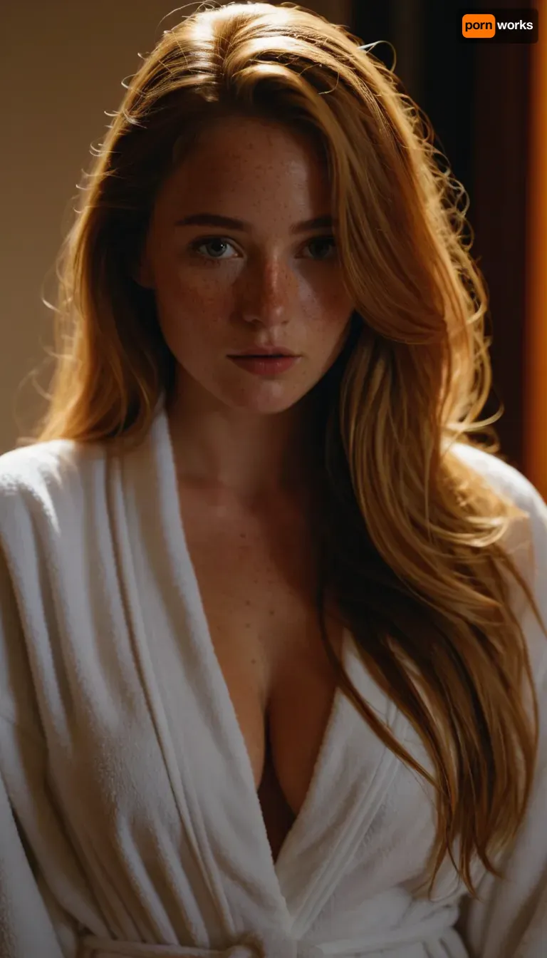 Shy girl next door that is secretly thick as hell with a round ass and perfect huge tits. Long light brown hair with golden highlights, freckles. Wearing white bathrobe, view to the front
