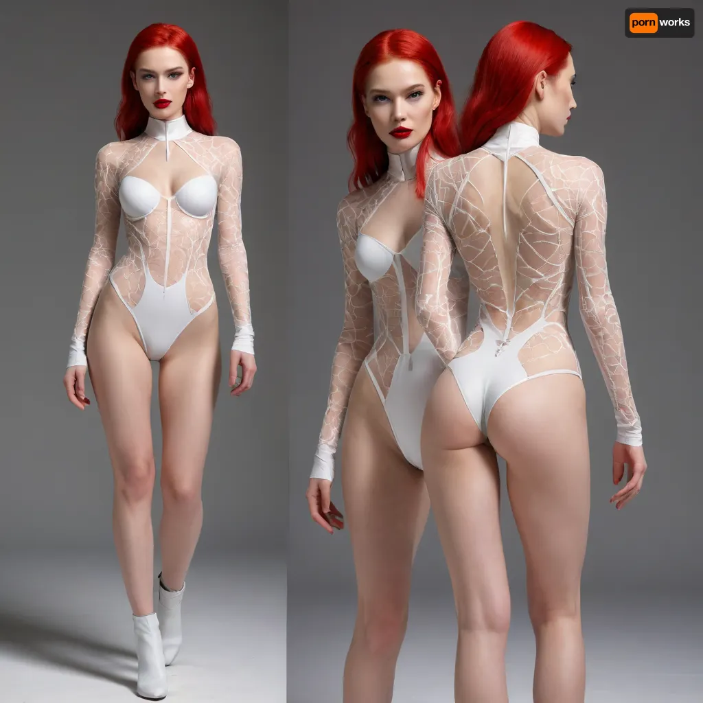 bodysuit fashion design, 2-views, (front view and back view), of Chinese fashion model with pale skin, red hair, is showcased wearing white avant-garde bodysuit, Avant-garde Urban Wear, Fusing an Assassin’s Creed aesthetic with elements of nature, long sleeves, drawing inspiration from Rinaldy Yunardi, complex, intricate designs and Ross Lovegrove futuristic Biomorphic style, Michelle Hébert, wearable art. The bodysuit is crafted from transparent and clear materials, vee neckline, harness style, constructed with an elegant, sophisticated structure. Set against a pristine, clean white background, the image focuses sharply on the model, emphasizing the details of the bodysuit. Bodysuit details are complete. The rendering aims for a hyper-detailed, high-resolution effect, employing techniques to achieve a photorealistic, hyper-realistic look that captures the fine textures and subtleties of the materials and design, ((heavy make-up with red lipstick)) bodysuit fashion design, 2-views, (front view and back view), of Chinese fashion model with pale skin, red hair, is showcased wearing white avant-garde bodysuit, Avant-garde Urban Wear, Fusing an Assassin’s Creed aesthetic with elements of nature, long sleeves, drawing inspiration from Rinaldy Yunardi, complex, intricate designs and Ross Lovegrove futuristic Biomorphic style, Michelle Hébert, wearable art. The bodysuit is crafted from transparent and clear materials, vee neckline, harness style, constructed with an elegant, sophisticated structure. Set against a pristine, clean white background, the image focuses sharply on the model, emphasizing the details of the bodysuit. Bodysuit details are complete. The rendering aims for a hyper-detailed, high-resolution effect, employing techniques to achieve a photorealistic, hyper-realistic look that captures the fine textures and subtleties of the materials and design, ((heavy make-up with red lipstick))