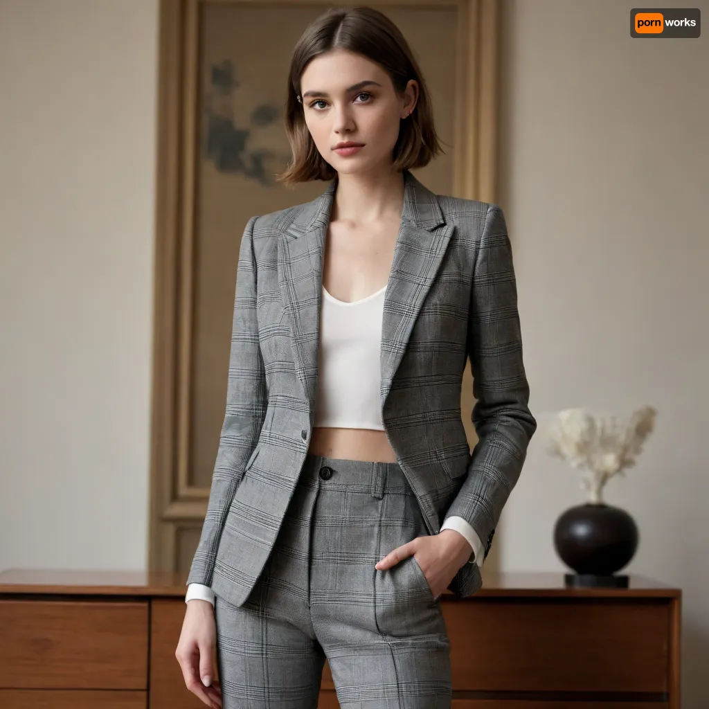 Minimalist Fashion Portrait Blends Tailoring and Provocation A recent photograph presents a striking example of contemporary fashion photography, balancing classic tailoring with a deliberate sense of provocation. The image centers on a young woman standing indoors, framed by a softly lit, domestic setting that includes framed artwork and wooden furnishings. The subject faces the camera directly, her posture composed and self-assured. She wears a cropped, black-and-white houndstooth blazer, left open at the front, creating a sharp contrast between structured menswear-inspired tailoring and exposed skin. The jacket’s clean lines and textured pattern draw immediate attention, emphasizing craftsmanship and form rather than ornamentation. Paired with the blazer are high-waisted, gray plaid trousers, tailored close to the body and styled in a restrained, understated manner. The trousers reinforce the classic aesthetic of the outfit, grounding the look in traditional fashion codes while allowing the open jacket to serve as the focal point. Her hair is cut into a sleek, chin-length bob, parted at the center, complementing the overall minimalism of the styling. Makeup appears subtle and controlled, with muted tones that keep the focus on the clothing and the subject’s expression rather than dramatic embellishment. Overall, the image reads as a modern fashion statement that challenges conventional boundaries between formality and exposure. It reflects an ongoing dialogue in the fashion world about confidence, autonomy, and the reinterpretation of classic garments for a contemporary audience.