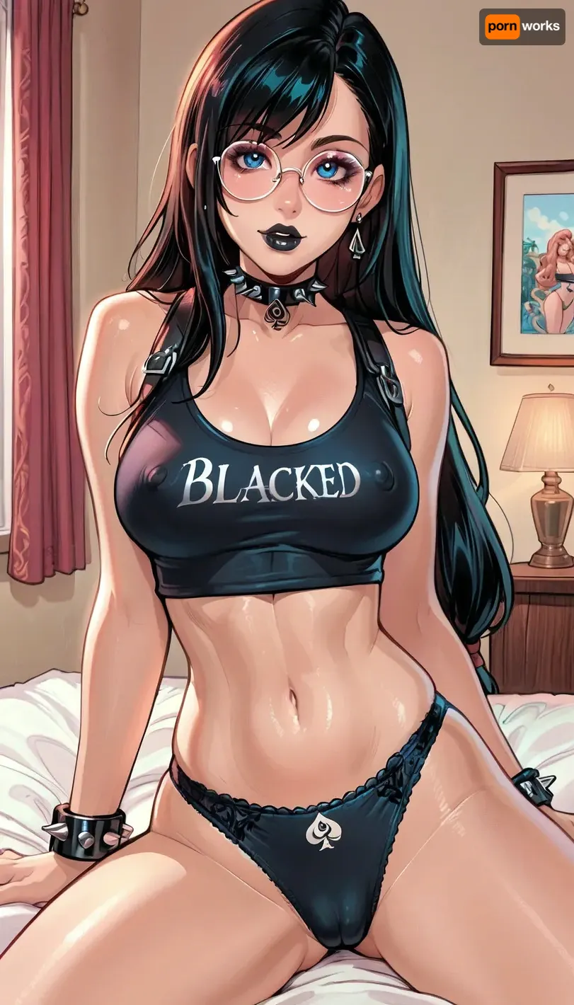 (reiq style:1), masterpiece, sexy pose, Tifa Lockhart, close up view, black hair with highlights, blue eyes, thick black round glasses, spiked choker, spiked bracelets, glamorous goth makeup, black lipstick, wearing blacked branded tank top, breasts focus, medium breasts, queen of spades branded panties, (camel toe:1), hard nipples under shirt, looking at viewer, panties on, side view, but she still looking at viewer, visible medium size butt, visible ass, tired but happy face, hourglass figure, pawg, lusty, covered in tattoos, lots of tattoos visible on body, tattoos on neck, tattoos on legs, queen of spades womb tattoo, cleavage, narrow waist, choker, bedroom, dynamic angle, legs are spread, Melkor Mancin artstyle, score_9, score_8_up, score_7_up, <lora:LCMTurboMix_Euler_A_fix:.6>, <lora:cartoon_stickers_xl_v1:.8>, <lora:ratatatat74-000050:1.3>, <lora:detailed_notrigger:2>, <lora:add-detail-xl:2> (reiq style:1), masterpiece, sexy pose, Tifa Lockhart, close up view, black hair with highlights, blue eyes, thick black round glasses, spiked choker, spiked bracelets, glamorous goth makeup, black lipstick, wearing blacked branded tank top, breasts focus, medium breasts, queen of spades branded panties, (camel toe:1), hard nipples under shirt, looking at viewer, panties on, side view, but she still looking at viewer, visible medium size butt, visible ass, tired but happy face, hourglass figure, pawg, lusty, covered in tattoos, lots of tattoos visible on body, tattoos on neck, tattoos on legs, queen of spades womb tattoo, cleavage, narrow waist, choker, bedroom, dynamic angle, legs are spread, Melkor Mancin artstyle, score_9, score_8_up, score_7_up, <lora:LCMTurboMix_Euler_A_fix:.6>, <lora:cartoon_stickers_xl_v1:.8>, <lora:ratatatat74-000050:1.3>, <lora:detailed_notrigger:2>, <lora:add-detail-xl:2>