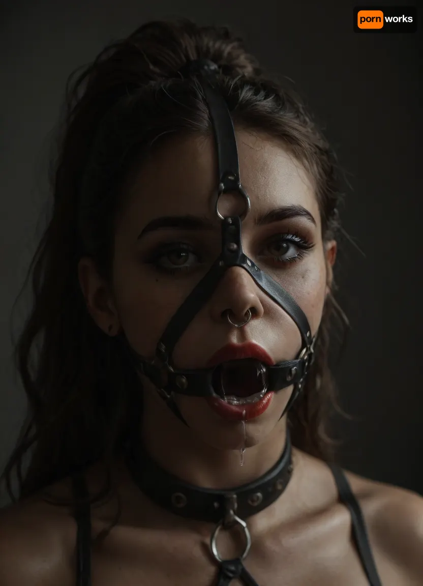 ((30 years old, Tipical italian girl, fit body, fake booobs, perfect cute face, curly very long brown hair in ponytail, brown eyes, light freckles, bimpo lips, skin pores, smooth skin, round ass, hips gap, oiled body)), ((heavy goth makeup, eyeshadow, eyeliner, mascara, red lipstick)), (slave collar), ((nose ring piercing, septum piercing:1.5)), (wearing a black thong), ((face harness gagged mouth:1.5)), ((drooling saliva from mouth, lot of saliva)), in a country apartment, harnessgag, <lora:add-detail-xl:1.3>, <lora:detailed_notrigger:1.2>, <lora:dark:.8>, <lora:harnessgag_xl-000003:1.3> ((30 years old, Tipical italian girl, fit body, fake booobs, perfect cute face, curly very long brown hair in ponytail, brown eyes, light freckles, bimpo lips, skin pores, smooth skin, round ass, hips gap, oiled body)), ((heavy goth makeup, eyeshadow, eyeliner, mascara, red lipstick)), (slave collar), ((nose ring piercing, septum piercing:1.5)), (wearing a black thong), ((face harness gagged mouth:1.5)), ((drooling saliva from mouth, lot of saliva)), in a country apartment, harnessgag, <lora:add-detail-xl:1.3>, <lora:detailed_notrigger:1.2>, <lora:dark:.8>, <lora:harnessgag_xl-000003:1.3>