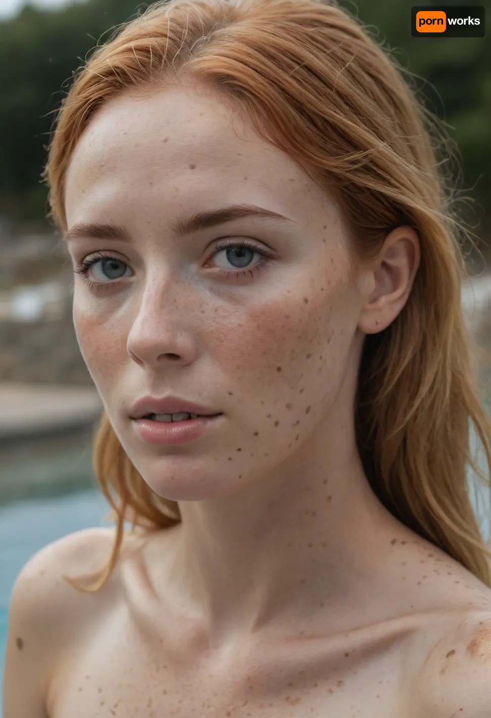 a portrait photo of a sweet young woman in her 20s, (European ethnicity:1.2), (detailed facial features:1.3), (anorexic:1.9), Dutch, natural makeup, slight gentle smile, (intricate mandala tattoo sleeve on left arm:1.2), (sun-kissed long blonde hair swept to the side:1.5), (blue eyes:1.2), wearing small diamond stud earrings, feet visible, really small tits, naked, (very small body), (texture skin visible:1.9), extremely detailed skin, ultra detailed, HDR, intricate details, natural lighting, soft focus, at a pool on a nice day, detailed, eyes, (freckles on face:2), skin, texture, photorealistic, artstation quality, 8k resolution, <lora:Super_Eye_Detailer_By_Stable_Yogi_SDPD0:.9>