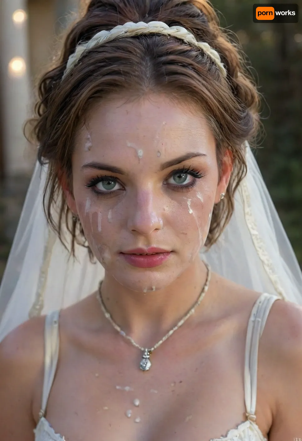 high resolution, high quality, dark scene at night, closeup of face, cute 46 years old woman, smile, pearl choker, pearl earrings, (Hair in elaborate updo:1.4), (((ropes of thick visible cum on her face:1.6))), cum dripping from face, cum on cleavage, (standing model posing, (wedding dress:1.2), (white corset:1.2), (wedding veil:1.3), (white lace gloves), very cute, smile, out of focus colorful flowers in a romantic outdoor background, outdoors, on, face, bukkake, cum), bellissima, bukkake, cum, 4m1c14, d3, Run3, 1girl, brunette, blue, eyes, freckles, clothing, undershirt, trousers, breeches, necklace, braided, ribbon, <lora:Wet_Makeup__Runny_Mascara-000006:1.4>, <lora:LesFemmesXL_v1.0:2>, <lora:MS_Real_XL_Bukkake:2>, <lora:Amicia_de_Rune:1.4>