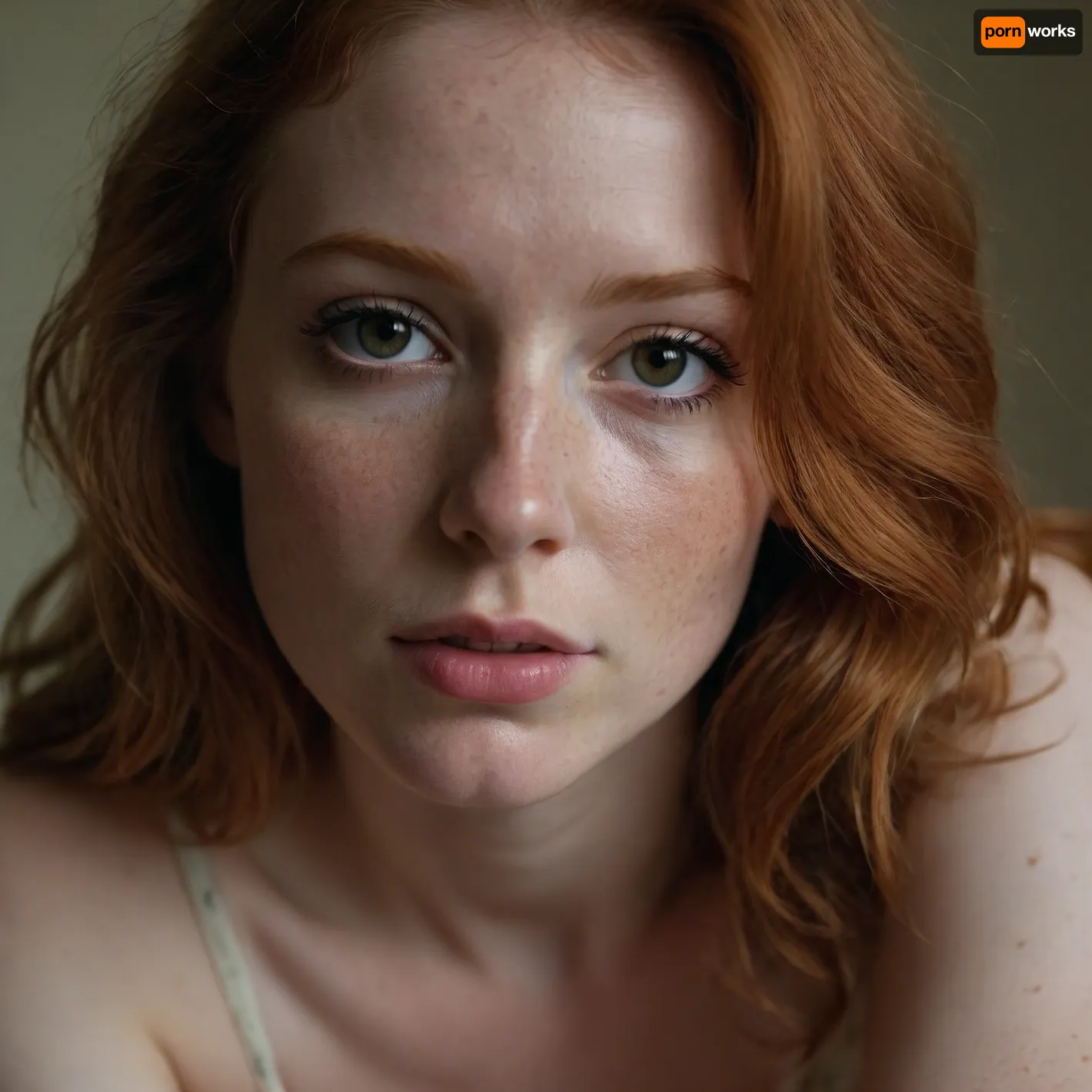 Pale freckled lady, flat stomach, protruding hip bones, wide hips, skinny, low hanging breasts, saggy tits, (pale), freckled chest, freckled face, freckled shoulders, ginger, unbuttoned, relaxed, loose jeans, bleached jeans, transparent teddy, leotard, contra posto, intense, blank stare, nose ring, wavy hair, medium long hair, brown eyed ginger, fit, 28 years old, tall, Faye Reagan, turtleneck