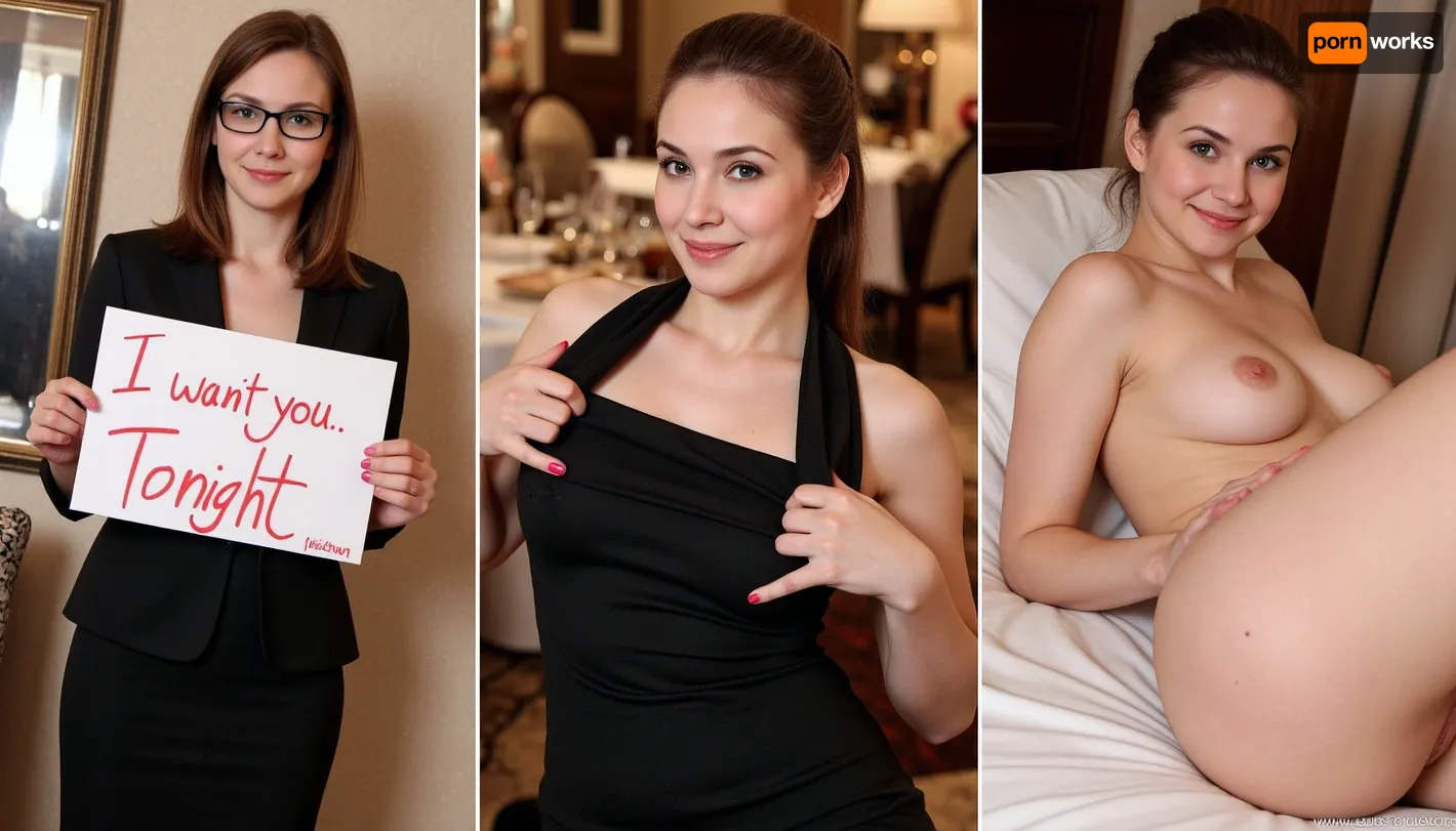 (side-by-side three pictures of a 35yo German woman with medium length brown hair), ., (On the first picture on the left she stands in an office, wears a business dress, glasses, and holds a handmade sign with text "I want you. Tonight"), (On the second picture in the middle she stands in an expensive restaurant, wears an elegant black evening dress and beautiful makeup, updo, jewelry, she is smiling seductively), (On the third picture on the right she seems very drunken and horny, ruined makeup, smeared mascara, (messy hair), nude, she is naked, (hairy detailed pussy), (wet pussy), laying on back in bed, full body view)