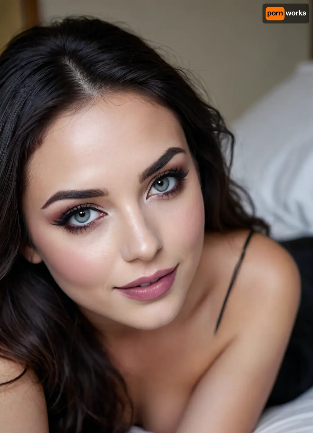 Gorgeous black haired girl with smokey eyes and deep dark lipstick smiling sexily while crawling to the camera, mouth slightly parted, heavy eyelids, thick long bold winged eyeliner, round face, bedroom, long wavy hair with pastel highlights cascading in front of her Gorgeous black haired girl with smokey eyes and deep dark lipstick smiling sexily while crawling to the camera, mouth slightly parted, heavy eyelids, thick long bold winged eyeliner, round face, bedroom, long wavy hair with pastel highlights cascading in front of her