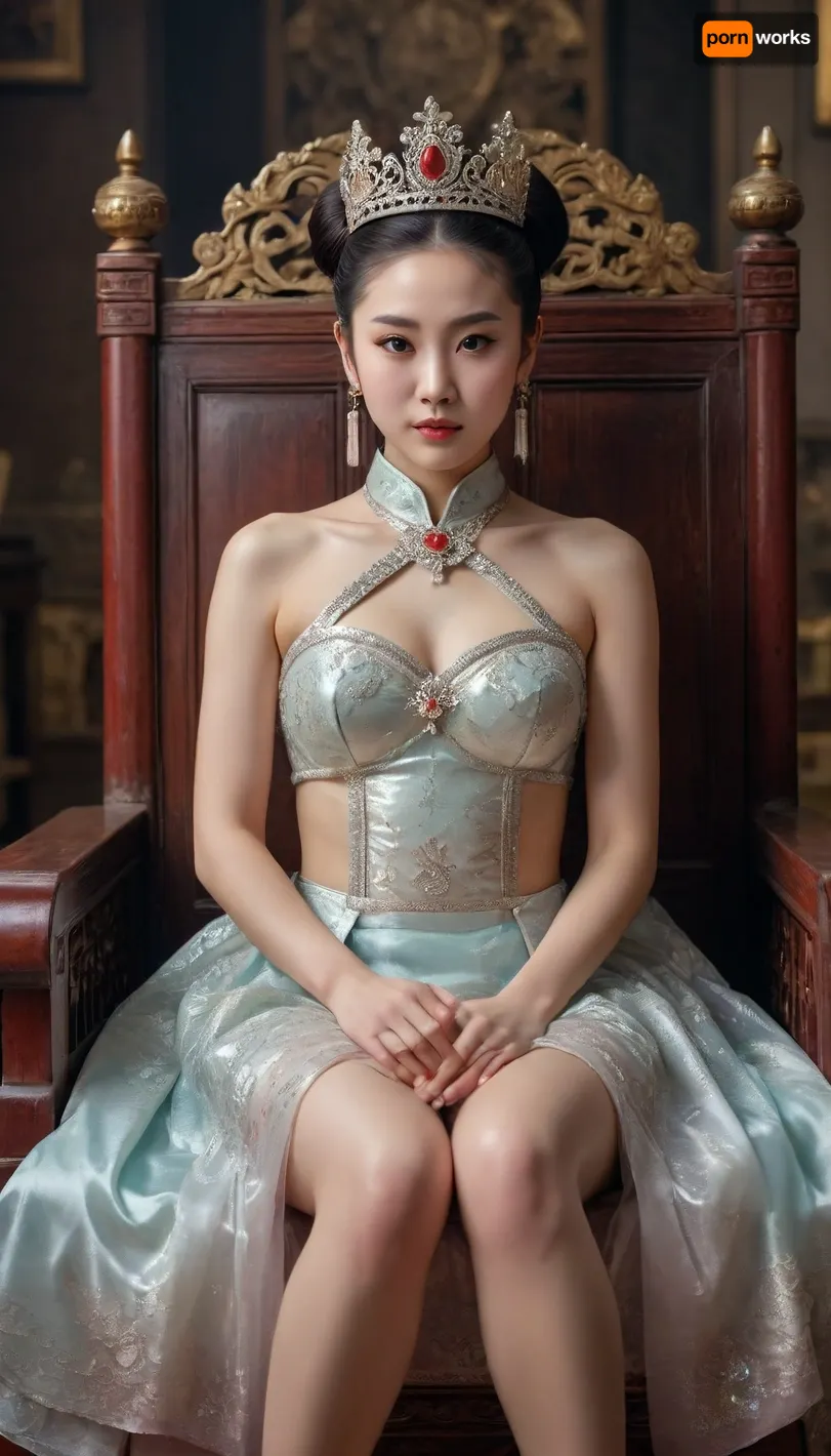 A Chinese princess in national clothes, her hair tied up in a bun, a tiara on her head, surrounded by her vassals, sits on a throne with her pussy exposed, legs wide apart A Chinese princess in national clothes, her hair tied up in a bun, a tiara on her head, surrounded by her vassals, sits on a throne with her pussy exposed, legs wide apart