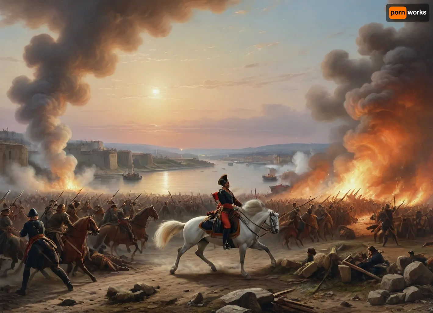 masterpiece, full color image, 8K quality, oil painting by a Russian artist, The painting depicts the very moment of the beginning of the storming of the fortress in the early morning. On the right, in the foreground, there is a cannon, from which Russian gunners fire a signal shot to attack. A.V. Suvorov is shown on the left, sitting on his white horse Mishka, and M.I. Kutuzov is on his right hand. Next to them are Russian soldiers and officers storming the bastions and walls of the burning Turkish fortress of Izmail. On the right side of the painting is the Danube River, where you can see the outlines of the boats of the landing troops. masterpiece, full color image, 8K quality, oil painting by a Russian artist, The painting depicts the very moment of the beginning of the storming of the fortress in the early morning. On the right, in the foreground, there is a cannon, from which Russian gunners fire a signal shot to attack. A.V. Suvorov is shown on the left, sitting on his white horse Mishka, and M.I. Kutuzov is on his right hand. Next to them are Russian soldiers and officers storming the bastions and walls of the burning Turkish fortress of Izmail. On the right side of the painting is the Danube River, where you can see the outlines of the boats of the landing troops.