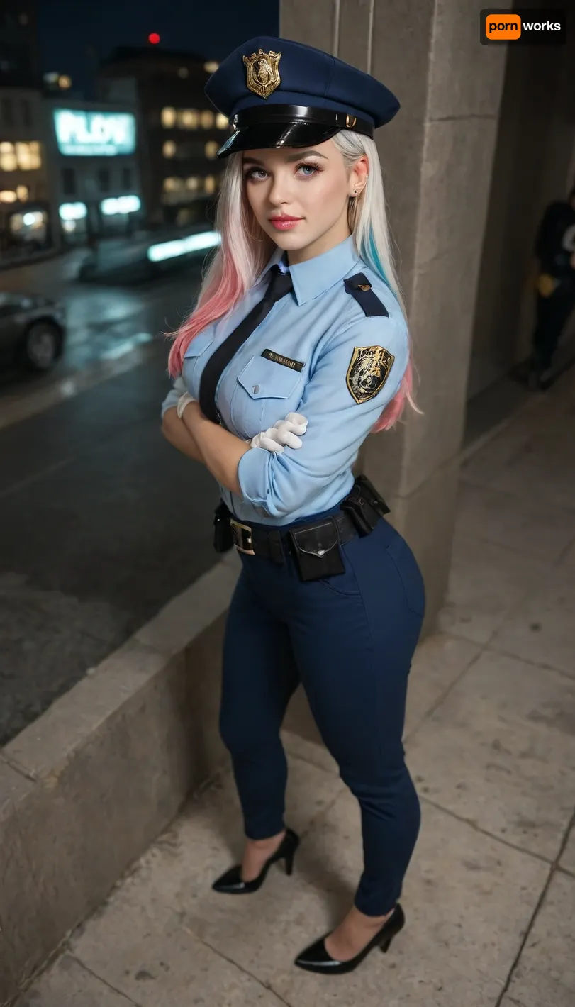 masterpiece, best quality, highres, absurdres, very awa, 1girl, solo, long hair, multicolored hair, black hair, white hair, pink hair, blue hair, ear piercing, lip piercing, policewoman, police uniform, collared shirt, white shirt, police hat, peaked cap, outdoors, sky, night, shadow, scenery, reflection, reflective floor, building, against wall, from side, crossed arms, pink eyes, pants, blue pants, belt, belt pouch, white gloves, jacket, blue jacket, from above, full body, looking at viewer, high heels, black footwear, wide shot, v-shaped eyebrows, smirk, parted lips masterpiece, best quality, highres, absurdres, very awa, 1girl, solo, long hair, multicolored hair, black hair, white hair, pink hair, blue hair, ear piercing, lip piercing, policewoman, police uniform, collared shirt, white shirt, police hat, peaked cap, outdoors, sky, night, shadow, scenery, reflection, reflective floor, building, against wall, from side, crossed arms, pink eyes, pants, blue pants, belt, belt pouch, white gloves, jacket, blue jacket, from above, full body, looking at viewer, high heels, black footwear, wide shot, v-shaped eyebrows, smirk, parted lips