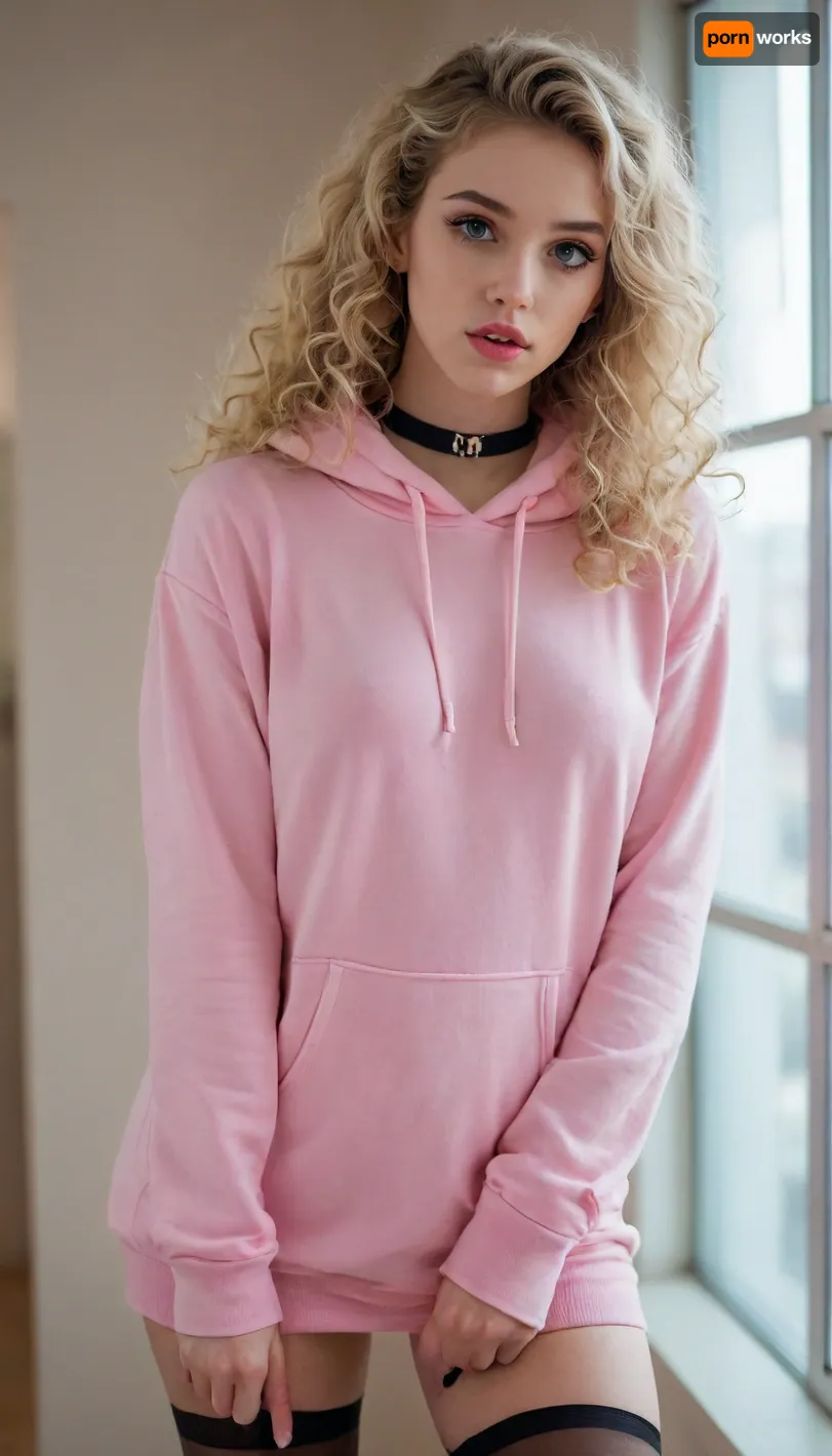 French female, second-year student, perfect figure, petite, (lanky:1.2), (big breast:1.2), curly blonde, big lips, Bright makeup, pink choker, white oversized hoodie, black stockings French female, second-year student, perfect figure, petite, (lanky:1.2), (big breast:1.2), curly blonde, big lips, Bright makeup, pink choker, white oversized hoodie, black stockings