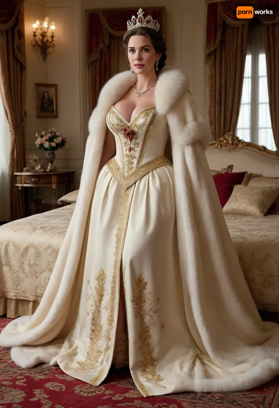 aristocratic bedroom, large grand room, most beautiful actress in the world, mature beautiful super star world class actress, queen’s crown, ((coronation gown)), (((fur imperial state robe))), floral embroidery, (ankle length dress skirt), hyper breasts, hyper ass, large, breasts, big, boobs, huge, tits, <lora:bombshell_v2:1.2>