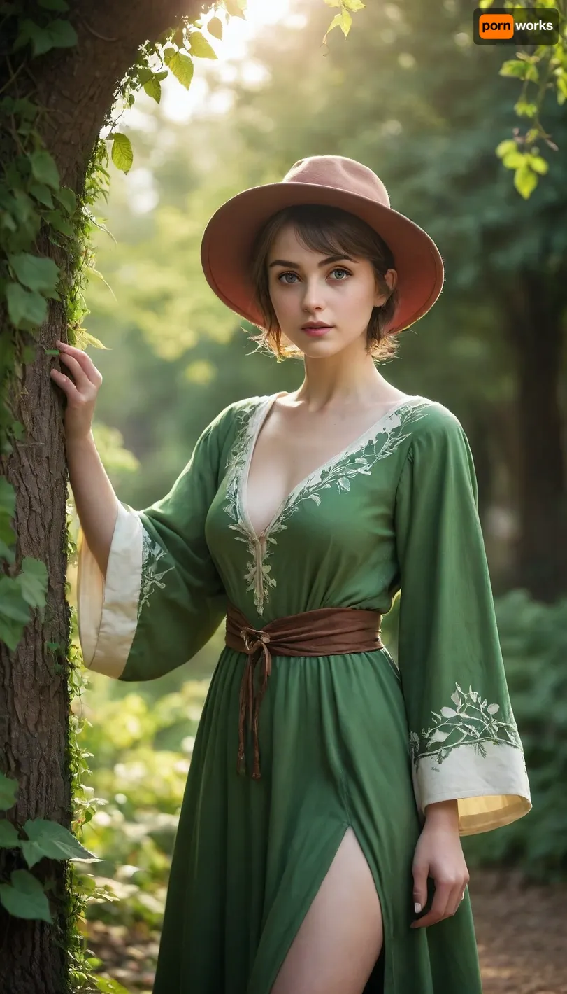 Realistic photography, Fantasy, magical, medieval, solo, 1girl, mage, mage robe, short loose dress, mage hat, leaf designs, short hair, round face, big bright eyes, broad shoulder, deep collarbone, squeezed cleavage, slim waist, calm, alluring, seductive, detail background, backlight, green nature healing magic circle, vines, leaf, tree, <lora:EnvyCuteSliderXL01:2> Realistic photography, Fantasy, magical, medieval, solo, 1girl, mage, mage robe, short loose dress, mage hat, leaf designs, short hair, round face, big bright eyes, broad shoulder, deep collarbone, squeezed cleavage, slim waist, calm, alluring, seductive, detail background, backlight, green nature healing magic circle, vines, leaf, tree, <lora:EnvyCuteSliderXL01:2>
