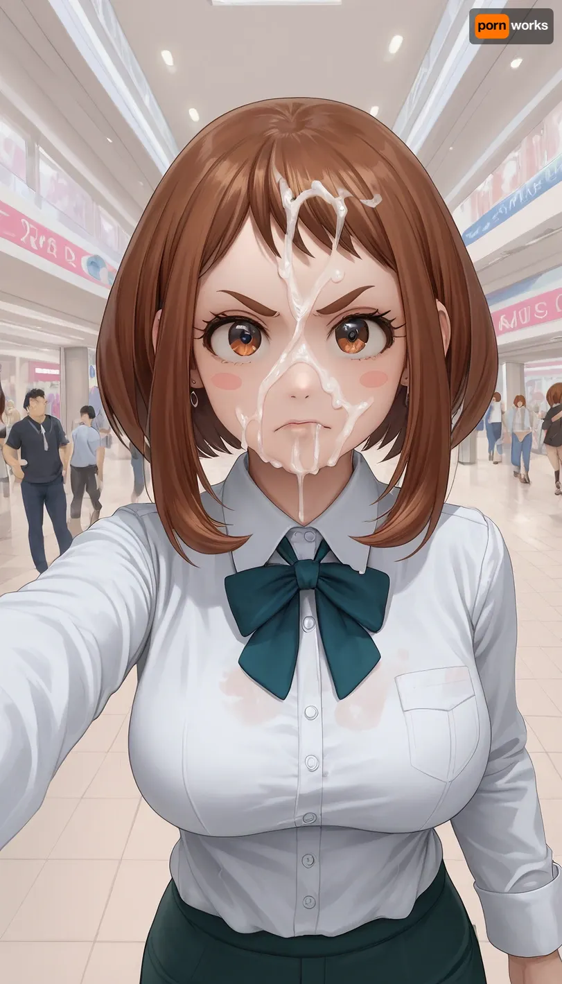 Ochako uraraka, Look a viewer, frown, face covered cum, cum on face, facial cum, angry expression, walking, in mall, Model, white collared shirt, selfie