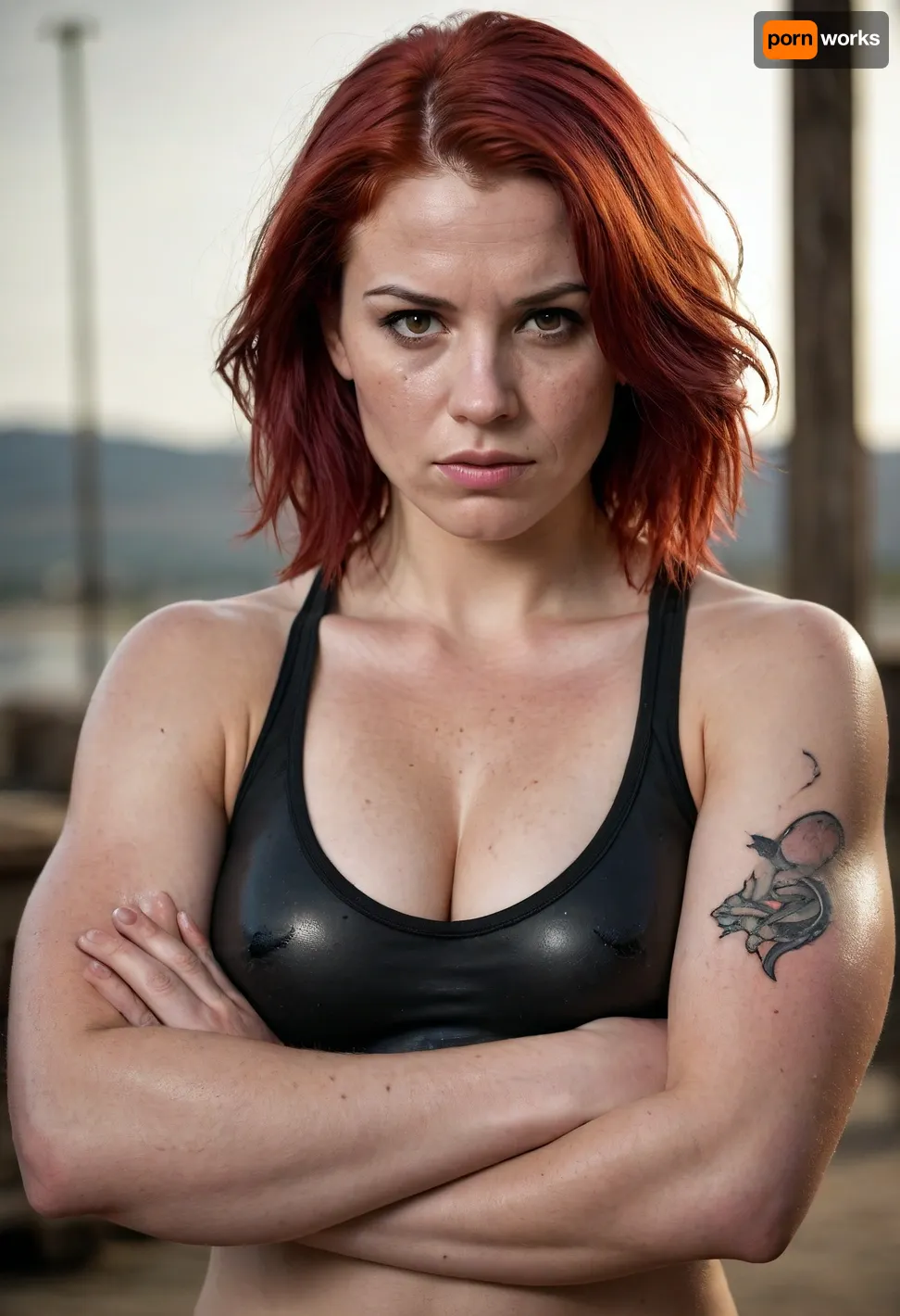 A strong large, red-haired chubby woman.The woman is wearing in a dirty multitran with traces of dirt and sperm, wet. The woman is wearing army pants dropped to the knees, rough boots, (brown eyes), .She has a very short haircut and wet straight hair, (burgundy-red hair color), hair wet with semen, (dirty streaks of dried sperm on her face), .She has a very freckled face and freckled body.Traces of violence on a woman's body.There is a only one tattoo, (picture of orca), on one of the woman's shoulders.She has wide lips, (Wide-lipped), . She is unkempt, dirty, and unattractive. She is very busty. The woman has very large, powerful, muscular shoulders and very strong, wide forearms. She is wearing a wristwatch with a round dial on one hand. She is large, healthy, strong, and powerful, (she has very strong, powerful, large shoulders and biceps), very powerful forearms.Very evil angry look at me.