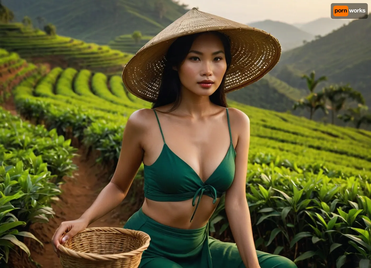 (scale image of young Vietnamese woman), (Asian facial features), (farmer picking tea), (curved terraces of tea bushes), (straw conical hat), 1. 2, (long black hair), (green top and pants), (vine woven basket), (close-up of delicate fingers), (terraced tea bushes), (bright direct sunlight, diffused light), (realistic color rendering), (photorealistic), (depth of field), (bokeh)