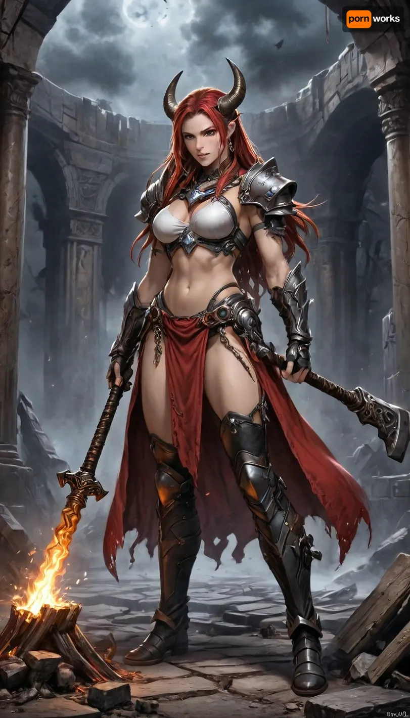 charactor card for TTRPG Guilded frame, Marvel comic Style Cover Art Concept, (world of warcraft art), tall female viking Blacksmith, wearing a brown leather apron bikini, wearing thigh hight brown leather books, wearing brown leather cuffs, wearing in her long red hair in a high french braid, holding a large hammer, in a medieval forge, full body framing, black and white line drawing, (comic book style), standing on a pile of bones and rubble, apocalyptic background, standing at edge of colossal underground abyss, glowing Hash-Nass hive below shaped like a malignant star, scale emphasizing inevitability and threat STYLE LOCK, (Epic dark fantasy illustration, mythic science-fantasy tone, painterly realism, Luis Royo inspired, dramatic lighting, high contrast, rich textures, flowing fabrics, ancient technology disguised as divine artifacts, cinematic composition, ultra-detailed, sharp focus, no modern elements, no text, no watermark), high contrast black and white, only one character, no horns, braided, Art, by, Boris, Vallejo, <lora:Mecha_Ggorgeous_Armor-000011:2>, <lora:Braided_Sides_V1:1.8>, <lora:Fantasy_art_XL_V1:1.4>, <lora:Granblue_Collection_XL_-_Heroes:2>