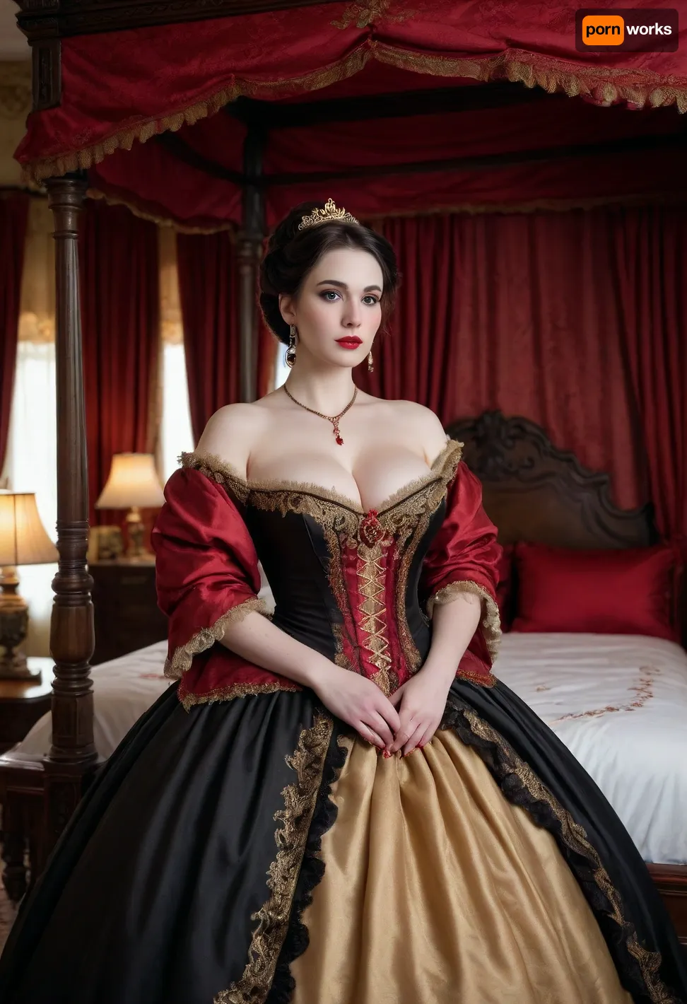 (Gothic aristocrat), very pale skin, Confident smirking 30 year old, luxurious red silk bedsheets, dark gloomy haunted castle bedroom, (victorian era noblewoman in black ballgown dress with red and gold embroidery, standing in front of bed), medieval era mansion bedroom, ((wooden canopy bed with red and golden accents bed curtains)), pitch black hair in a hair bun, arms crossed under breasts, many many pillows, embroidered ball gown, hourglass ballgown, white fur shawl, frills, frilly pillow trim, frilly dress trim, (Hyper breasts, top heavy, huge breasts, hyper tits, gigantic tits) (Gothic aristocrat), very pale skin, Confident smirking 30 year old, luxurious red silk bedsheets, dark gloomy haunted castle bedroom, (victorian era noblewoman in black ballgown dress with red and gold embroidery, standing in front of bed), medieval era mansion bedroom, ((wooden canopy bed with red and golden accents bed curtains)), pitch black hair in a hair bun, arms crossed under breasts, many many pillows, embroidered ball gown, hourglass ballgown, white fur shawl, frills, frilly pillow trim, frilly dress trim, (Hyper breasts, top heavy, huge breasts, hyper tits, gigantic tits)