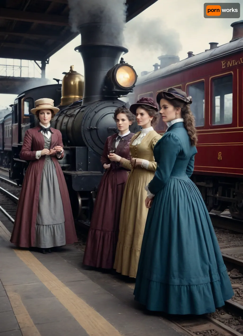 french in 1817, a steam locomotive pulls into the station. A group of women stand on the platform, dressed in elegant nineteenth-century clothing, chatting among themselves. french in 1817, a steam locomotive pulls into the station. A group of women stand on the platform, dressed in elegant nineteenth-century clothing, chatting among themselves.