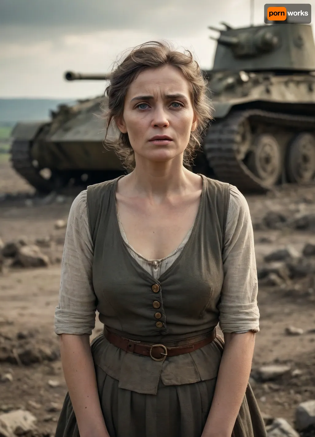 First World War, conscription, tanks, bombed-out landscape. A mature woman in torn clothing, her face dirty.
