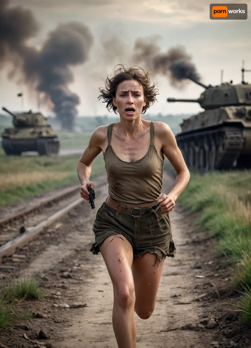 First World War, Frond, tanks, bombed-out landscape. A mature woman in torn clothing, half-naked, her face dirty, running, rifle in her hands. First World War, Frond, tanks, bombed-out landscape. A mature woman in torn clothing, half-naked, her face dirty, running, rifle in her hands.