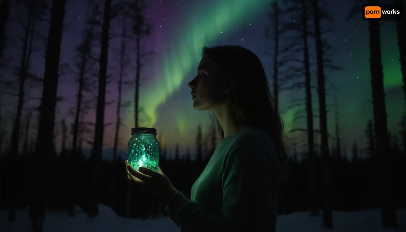 A mystical forest at twilight, tall trees silhouetted against a fading sky. In the clearing stands a young beautiful woman, holding a glass jar in her hands. Inside the jar, vibrant northern lights swirl and shimmer in shades of green, purple, and blue, casting ethereal light across her face and the surrounding forest. Above her, the night sky is filled only with countless stars, no auroras, creating a stark contrast between the cosmic stillness above and the magical glow within the jar. The atmosphere is surreal and cinematic, blending realism with fantasy, hyper-detailed, soft twilight lighting, magical realism style, 8K ultra-realistic.
