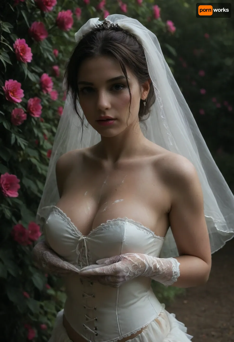 high resolution, high quality, dark scene at night, closeup of face, cute woman, smile, pearl choker, pearl earrings, (Hair in elaborate updo:1.4), (((multiple loads of thick visible cum on her face:1.6))), cum dripping from face, cum on cleavage, (standing model posing, (wedding dress:1.2), (white corset:1.2), (wedding veil:1.3), (white lace gloves), very cute, smile, out of focus colorful flowers in a romantic outdoor background, outdoors, on, face, bukkake, cum), bellissima, bukkake, cum, astonrichardsxl, <lora:Wet_Makeup__Runny_Mascara-000006:1.4>, <lora:LesFemmesXL_v1.0:2>, <lora:MS_Real_XL_Bukkake:2>, <lora:dark:.9>, <lora:astonrichardsxl:2>