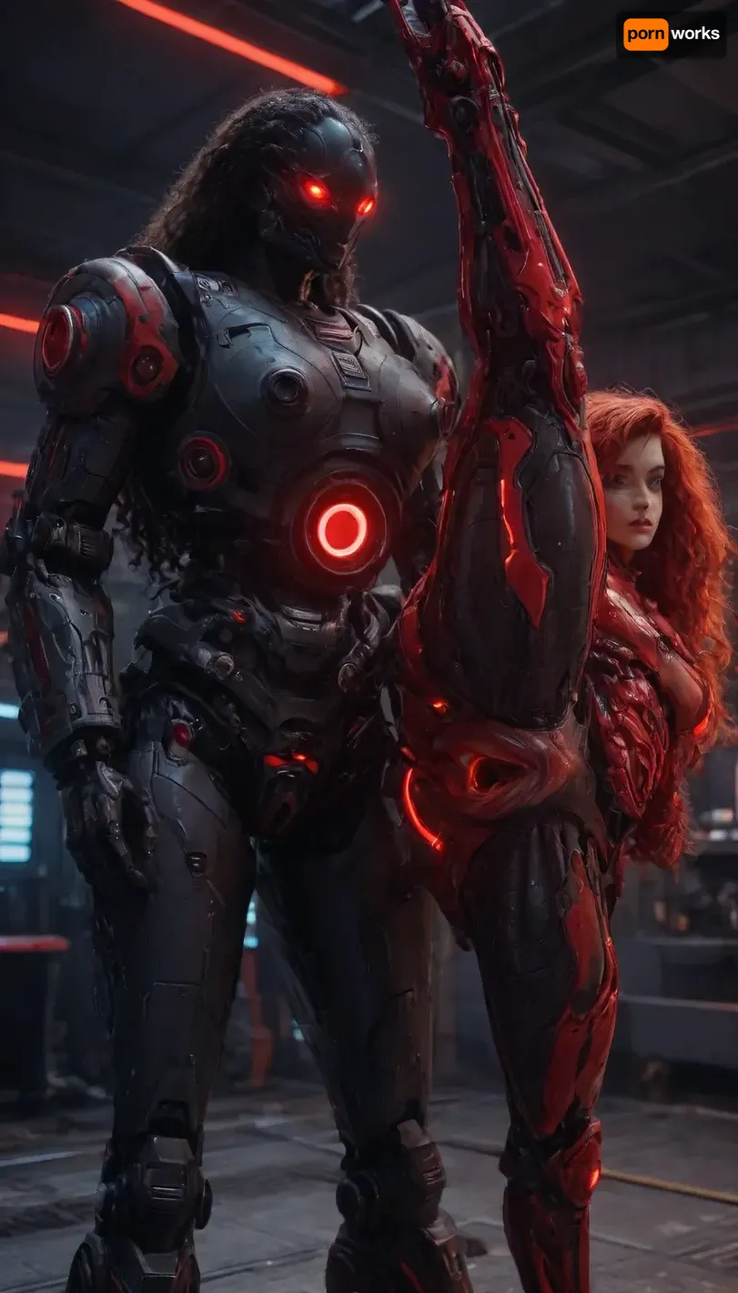 Princess Ariel, (robotic black mech red neon glowing armor:1.9), futuristic plasma-gun, spaceship interior, (hyper spread pussy, hyper gaping pussy, doing standing gymnastics), <lora:Mecha_Ggorgeous_Armor-000011:1>