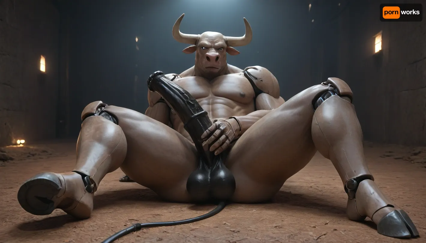 muscular male android, transparent robotic parts with glowing lights, mechanical body parts, guns in hand, fixed stare straight ahead, full body view. 1solo furry cyborgbull, solo, full body view, front view, full figured big anthro robot bull exposes its self, huge knotty cock, big ass, wide open asshole, hard erection, full exposed, hooves, horse phallus, horse penis, equine cock. Bovine android. Horns. Bulky. Flared cock. Bulky. Cow tail. Minotaur android. Cyborg Minotaur. Robot penis. Metal skin. Chrome plated. Exposed wires. Metal horns. Robot with a bull head. Mechanical body. Robot body. Cute cow face. Bovine head shape. Hooves. Metal body parts. Robot arms. Cybernetic implants. Glowing light in chest. Metal skin. Chrome skin. Robotic legs. Metal hooves. Sci-fi. Metal face. Glowing robot eyes. Mostly robotic. 25% flesh. Metal cock. Visible robo joints. Stroking his robocock. Cumming a black liquid, masturbation, orgasm, black cum, black semen. Hand on own penis. Black liquid coming out of cock. Erect cock. Lots of cum. Oversized balls. Laying down.