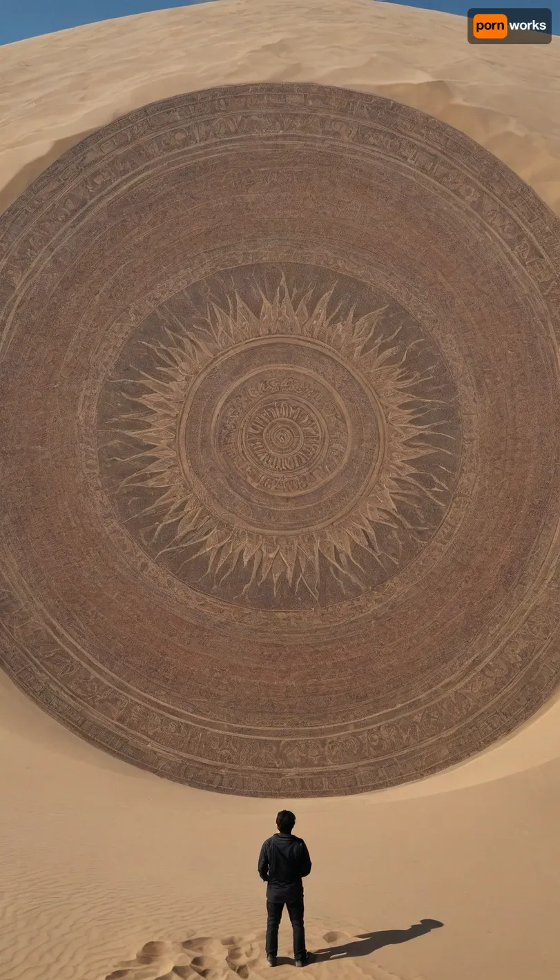 a tibetan Artist, scratches a giant mandala, in a big dune of a sand desert