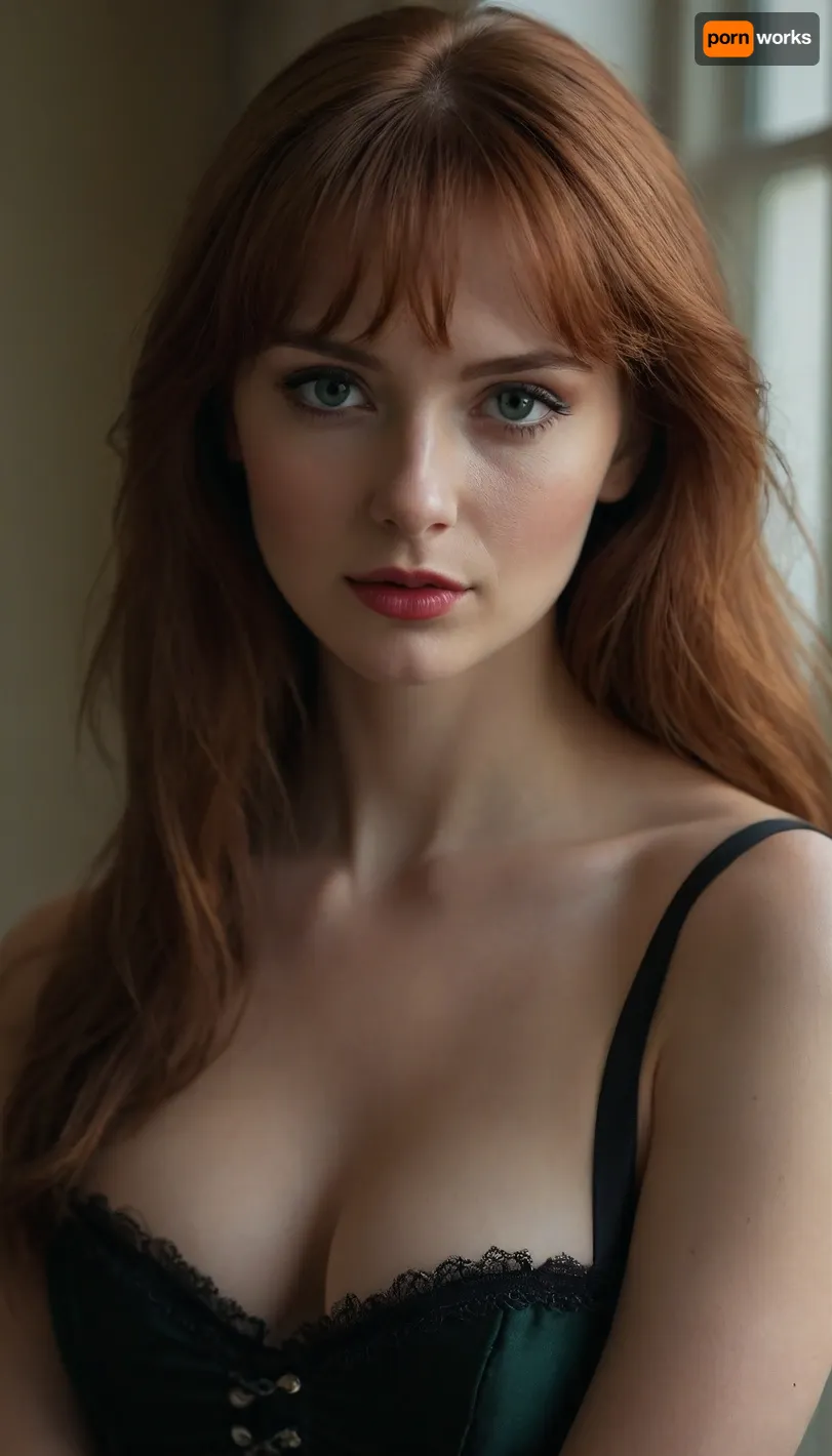 A close-up photo of a woman from Poland, with long red hair and bangs, wearing a black corset. She has a serene expression in her almond-shaped eyes, expressive green eyes, soft lips with a hint of red lipstick, and smooth, fair skin with a hint of natural glow. Her makeup includes subtle eye shadow, mascara and a light blush that highlights her cheekbones. Her hand is gently placed near her shoulder, showing off her manicured nails. She stands near a softly lit window, the soft natural light highlighting her features. The background is slightly blurred, focusing on the face and upper body. break high resolution camera, close-up lens, natural lighting, modern realism, soft shadows, intimate scenery, HD quality, natural look