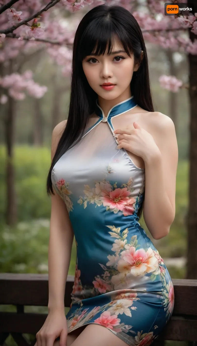 (masterpiece, top quality, best quality, official art, beautiful and aesthetic:1.2), hdr, high contrast, wideshot, 1girl, long black straight hair with bangs, looking at viewer, relaxing expression, clearly brown eyes, longfade eyebrow, soft make up, ombre lips, large breast, hourglass body, finger detailed, BREAK wearing half naked floral cheongsam, holding flower, (smeling flower), (spring season theme:1.5), windy, spring forest background detailed, by KZY, BREAK frosty, ambient lighting, extreme detailed, cinematic shot, realistic ilustration, (soothing tones:1.3), (hyperdetailed:1.2)
