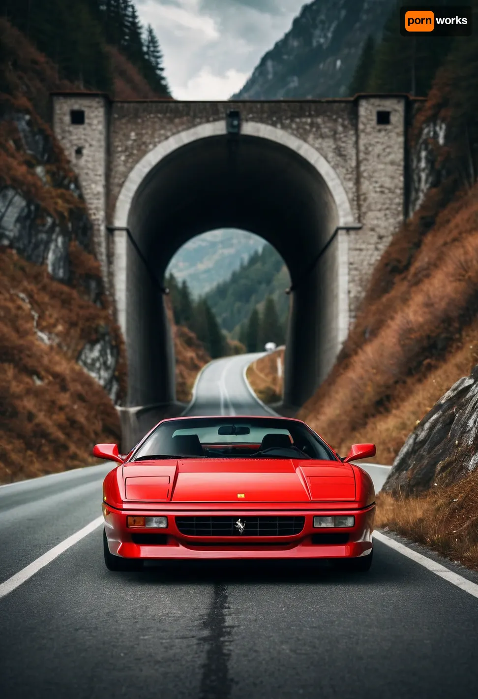 A realistic photo of a red Ferrari 348 in front of a tunnel on a lonely European mountain road A realistic photo of a red Ferrari 348 in front of a tunnel on a lonely European mountain road