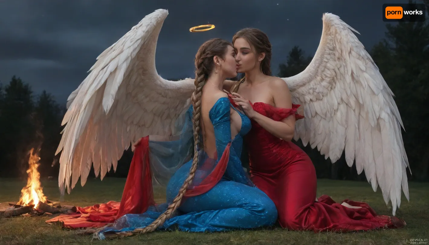 brunette demon girl with small red horns and red bat-like wings in red dress sitting on grass, blonde angel girl with massive white dove wings in blue dress behind her, long blue silk dress, ((long thick braid), , :2), lesbians, m size boobs, exposed breast, 6ft tall, kiss, (massive wings), (fire horns), campfire, halo, (night), (fisting), saint, evil, dancing imps brunette demon girl with small red horns and red bat-like wings in red dress sitting on grass, blonde angel girl with massive white dove wings in blue dress behind her, long blue silk dress, ((long thick braid), , :2), lesbians, m size boobs, exposed breast, 6ft tall, kiss, (massive wings), (fire horns), campfire, halo, (night), (fisting), saint, evil, dancing imps