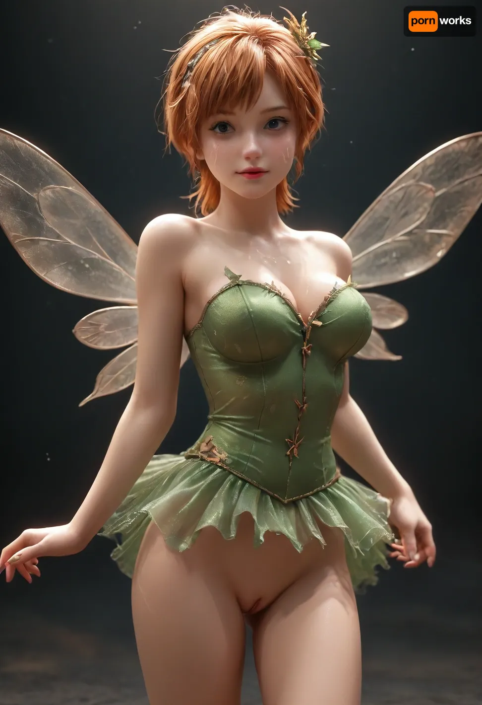 Tinker Bell shines with a soft golden aura, translucent wings shimmering, sweet and confident expression, large breasts, tight clothes, low-cut outfit, exposed vulva. Peter Pan watches with an enchanted smile and a look of admiration.