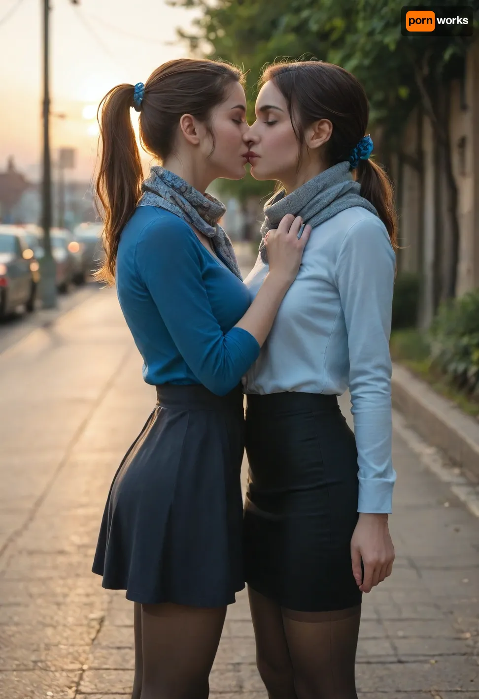 beautiful, gorgeous, 25_year_old, French woman, (Beautiful_French_woman), kissing her girlfriend passionately, in the evening, dimmed_lighting, after_sunset, reflective_skin, (wearing a blue long-sleeve shirt, scarf, skirt, pantyhose), medium_height, long_hair, dark_hair, blue_scrunchie, ponytail, blue_eyes, perfect_figure, average_breasts, small_nose, thin_lips, jewelry, flower, (girlfriend is wearing a casual dress) beautiful, gorgeous, 25_year_old, French woman, (Beautiful_French_woman), kissing her girlfriend passionately, in the evening, dimmed_lighting, after_sunset, reflective_skin, (wearing a blue long-sleeve shirt, scarf, skirt, pantyhose), medium_height, long_hair, dark_hair, blue_scrunchie, ponytail, blue_eyes, perfect_figure, average_breasts, small_nose, thin_lips, jewelry, flower, (girlfriend is wearing a casual dress)