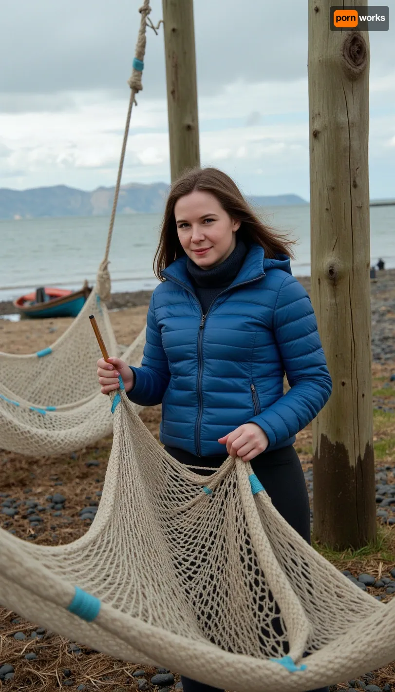 photorealistic, realistic, Icelandic fisherwoman fixing a fishing net on the seashore, highly detailed, cinematic lighting