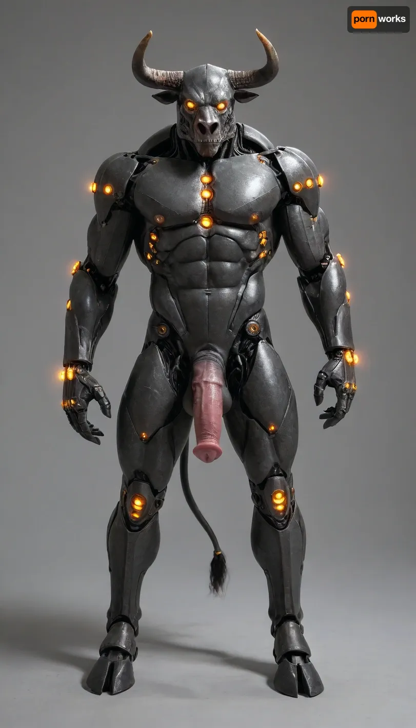 muscular male android, transparent robotic parts with glowing lights, mechanical body parts, guns in hand, fixed stare straight ahead, full body view. 1solo furry cyborgbull, solo, full body view, front view, full figured big anthro robot bull exposes its self, huge knotty cock, big ass, wide open asshole, hard erection, full exposed, hooves, horse phallus, horse penis, equine cock. Bovine android. Horns. Bulky. Flared cock. Bulky. Cow tail. Minotaur android. Cyborg Minotaur. Robot penis. Metal skin. Chrome plated. Exposed wires. Metal horns. Robot with a bull head. Mechanical body. Robot body, transparent skull with visible brain. Cute cow face. Bovine head shape. Hooves. Metal body parts. Robot arms. Cybernetic implants. Glowing light in chest. Metal skin. Chrome skin. Robotic legs. Metal hooves. Sci-fi. Metal face. Glowing robot eyes. Mostly robotic. 25% flesh. Metal cock. Visible robo joints