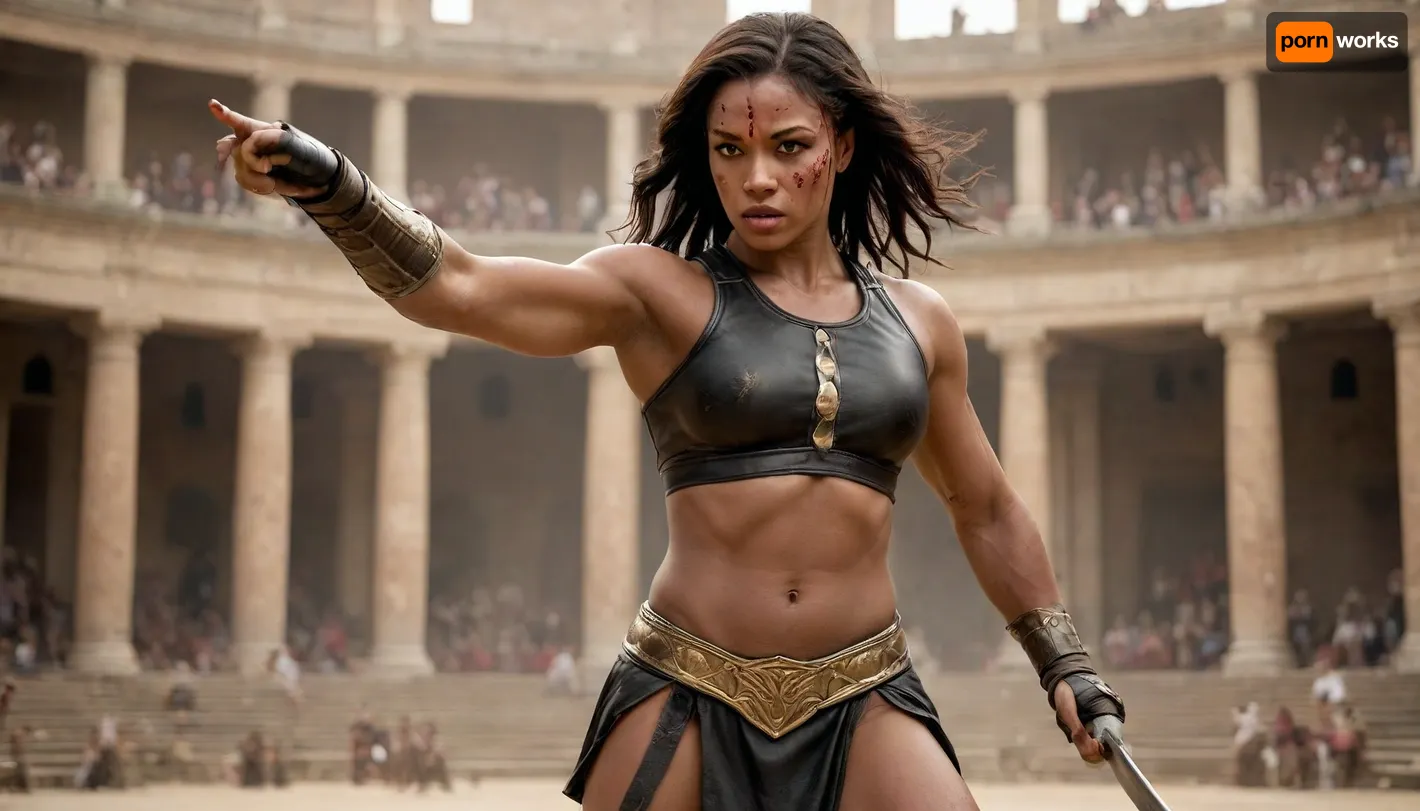 Create 2 females warriors, First females IS a Beautiful 30yo woman, WET Dark Brown straight hair, big saggy tits with big nipples and hairy pussy visible, topless with bare back and muscular physique, long hair blowing in the wind, wearing a tattered short leather gladiator skirt with ornate metal belt and thigh straps, holding a large round battered shield in one hand and a gladius sword in the other, whole body covered in bruises and abrasions, pain expression, gladiator standing in a Roman coliseum arena, 3/4 view, dramatic golden hour lighting, sweat-glistened skin, crowded blurred spectators in the background, epic cinematic atmosphere, lion in the background, Dynamic view, Dynamic pose, highly detailed, photorealistic, 8k, style raw., action, shot, all bruised up, (cuts and wounds on whole body:1.6), ((muscular ebony black female fighter)), ((long muscles)), hyperrealistic, (tall woman), ((muscular woman)), broad shoulders, large breasts, long black hair, ((strong physique)), ((detailed abs and arms)), dark brown leather and gold bra and skirt, gold jewelry, mma gloves, in an arena scene, pale tan skin, lots of detail on clothing and armor, sharp expression, intense expression, (mid-punch pose), powerful stance, close up view, <lora:Manga_Action_Shot:.8> Create 2 females warriors, First females IS a Beautiful 30yo woman, WET Dark Brown straight hair, big saggy tits with big nipples and hairy pussy visible, topless with bare back and muscular physique, long hair blowing in the wind, wearing a tattered short leather gladiator skirt with ornate metal belt and thigh straps, holding a large round battered shield in one hand and a gladius sword in the other, whole body covered in bruises and abrasions, pain expression, gladiator standing in a Roman coliseum arena, 3/4 view, dramatic golden hour lighting, sweat-glistened skin, crowded blurred spectators in the background, epic cinematic atmosphere, lion in the background, Dynamic view, Dynamic pose, highly detailed, photorealistic, 8k, style raw., action, shot, all bruised up, (cuts and wounds on whole body:1.6), ((muscular ebony black female fighter)), ((long muscles)), hyperrealistic, (tall woman), ((muscular woman)), broad shoulders, large breasts, long black hair, ((strong physique)), ((detailed abs and arms)), dark brown leather and gold bra and skirt, gold jewelry, mma gloves, in an arena scene, pale tan skin, lots of detail on clothing and armor, sharp expression, intense expression, (mid-punch pose), powerful stance, close up view, <lora:Manga_Action_Shot:.8>