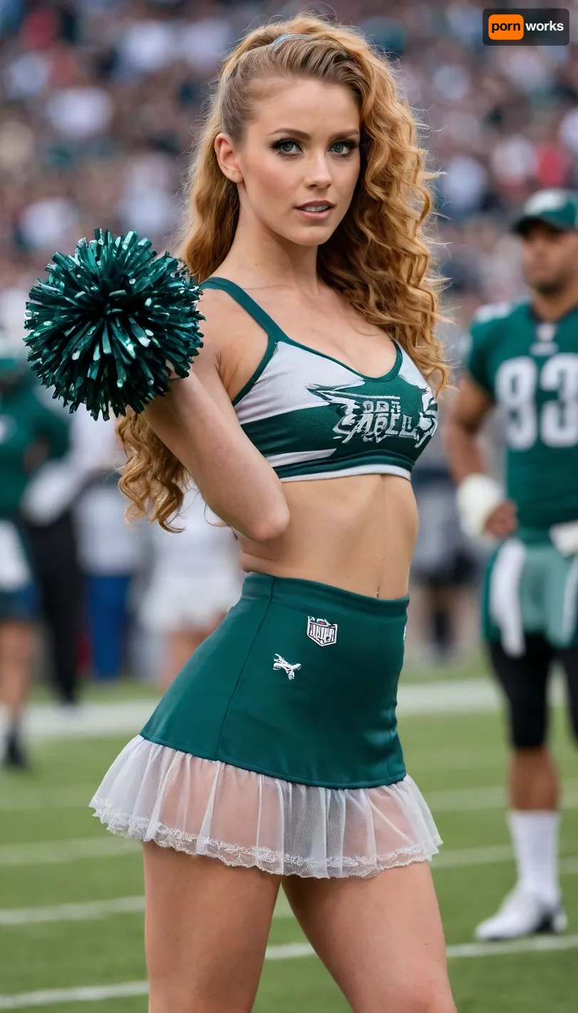 Philadelphia Eagles football cheerleader on field, dark green and silver uniform with the word "EAGLES", with big silver cheerleading pom pom, very sexy skirt, seeing lace panties, can see panties, very long ginger curly ponytail hair, bright green eyes, small breasts, game ambient, players behind her