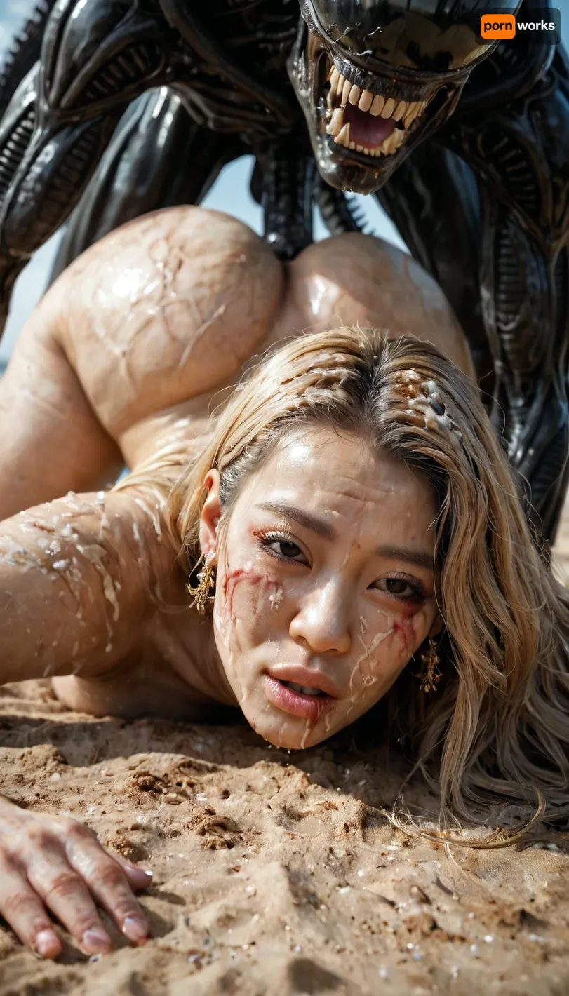 (Asian:1.5), blue veiny skin, guaru, detailed dirty face, facial wrinkles, Dried lips with bleeding cracks, 28 years old, ebon skin, very long blonde hair, very dirty hair, big space eyes, alluring makeup, small boobs, very large huge light cellulite ass, naked, ass up, anal sex, fucking by a xenomorph, zoophilia, pleasure, moaning, face focus, dirty beach everywhere