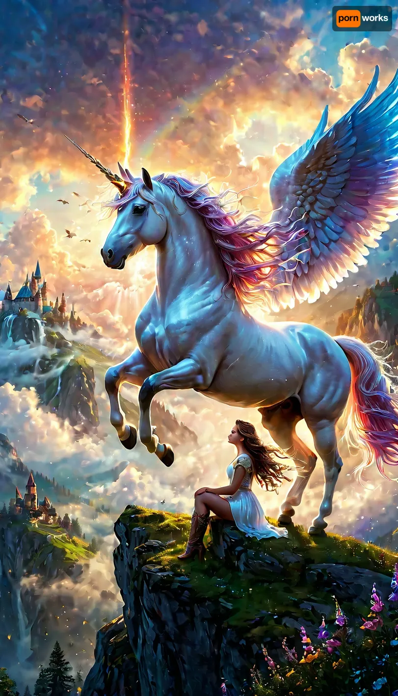 ((a girl facing away looking at majestic realistic unicorn)), ((the unicorn is flying in air with large wings)), ((the girl has a magical glowing staff)), (sitting in atop a misty hill with a horse with horn on its head), center opening, official art, extremely detailed CG unity 8k wallpaper, perfect lighting, Colorful, Bright_Front_face_Lighting, shiny skin, (masterpiece:1), (best_quality:1), ultra high res, 4K, ultra-detailed, photography, 8K, HDR, highres, (absurdres:1.2), Kodak portra 400, film grain, blurry background, (bokeh:1.2), lens flare, (vibrant_color:1.2), professional photograph, (beautiful_face:1.5), cinematic, great shading, moody lighting, cloudy weather, (by Hope Gangloff:1), perfecteyes, <lora:lora-sdxl-perfect-eyes:.5>, <lora:add-detail-xl:1>, <lora:Vivid Midjourney mimic - XL SDXL v2.0:.5>, unicorn, <lora:unicorn_xl_v1:.5>, <lora:detailed_notrigger:.5>