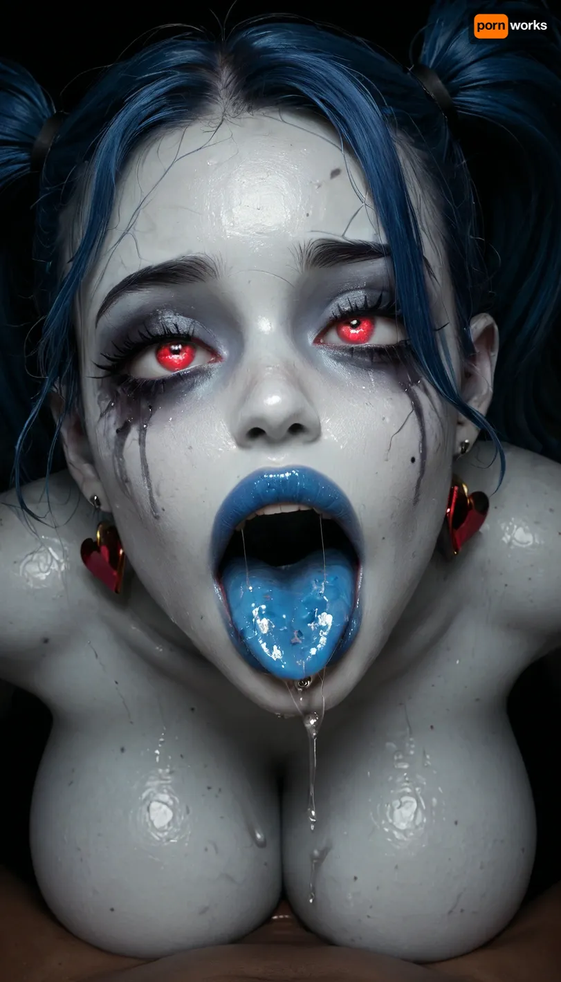 1girl, blue hair, blue eyes, white skin, (zombie skin), zombie, zombie makeup, (pale skin:1), (face close up), blue tongue out, lots of spit, saliva dripping down, ahegao, orgasm, sweating, red heart eyes, top down view, on knees, massive breasts, blue lipstick, twintails, ruined, makeup, <lora:xl_mega_twin_drills-1.0:.5>, <lora:dark:.6>, <lora:dvr-shrp:.8>, <lora:Image Enhancer XL Extreme v1:.8>, <lora:Rawfully Stylish v0.2_epoch_20:.7>