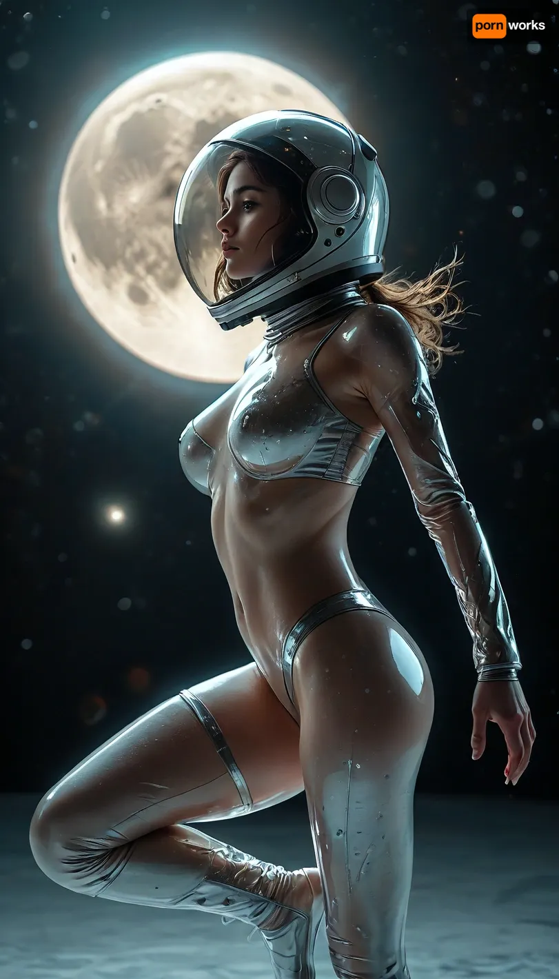 Rating_explicit, in space, nude woman wearing a fully transparent space suit, huge breasts, hairy pussy, mid-motion, dynamic dance pose, sensual pose, weightless motion, sci-fi explicit fantasy, dancing gracefully in vacuum of open space, highlighted by dramatic rim lighting from full moon, (huge moon on background), moon glowing in the black sky, silver reflections on her curves, space helmet with open face, photorealistic, masterpiece, ultra high resolution, cinematic lighting, black space background with stars, D3m0n, D4nc1ng, movement, dancing, portrait, girl, <lora:MJ52:.8>, <lora:Demon_Dancing:.8>, <lora:artfullyXLDANCE_SDXL_V:.8>