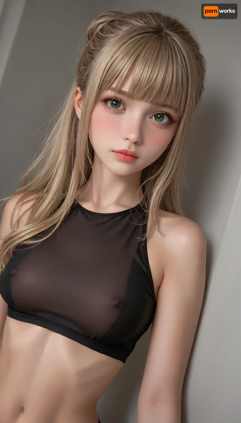 (Dinamic random photo angle and frame:1.8), (Realistic amateur photo), 8k, (candid photo), french amateur petite girl, 19yo, delicate natural beauty, blush, (bright green eyes with eyelashes and eyeliner), sharp face features, (balayage blonde long hair with bangs), pale oily skin, fit skinny body, tiny tits, narrow waist, fit abs, thin legs, (black see-through crop top and slutty miniskirt with upper g-string visible), realistic skin texture, realistic detailed face, night time, dark, happily aroused and excited. in luxurious living room., (extreme detailed face), (perfect teething), (hiperrealistic skin texture), detailed, freckles, tiny moles, big glossy lips, Caucasian woman, beautiful face, tan skin, horny expression, beautiful, perfect face, makeup, (overflowing cameltoe:1.5), (fat pussy), (dinamic pose:1.3), (overflowing vulva), (overflowing pusdy lips), waist, oiled skin, gorgeous, looking at viewer seductively, seductive eyes, model, topless, stockings and garters, waist shot, tan lines, black long hair, shy, blue eyes, (comically hyper puffy swollen vulva), rounded ass, large rounded breasts, nice pussy, perfect feminine Estonian face, seductive, (hair up in bun), <lora:add-detail-xl:.8>, <lora:jesalba_xl_1_standard_merger_29_60_83_05_02_03:.8>