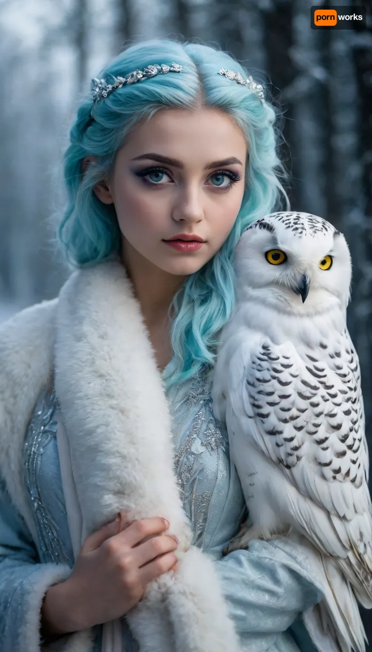 20000421.0, (((Very Petite girl))), A striking fantasy portrait of an elegant woman with ice-blue hair, her piercing eyes lined with shimmering blue makeup. A majestic snowy owl perches on her shoulder, mirroring her gaze with its own deep, intelligent eyes. She wears a luxurious faux-fur coat in a matching cyan hue, blending seamlessly into the cool-toned background. The soft lighting and icy atmosphere give the image an ethereal, mystical quality, as if she belongs to a world of winter magic and hidden…