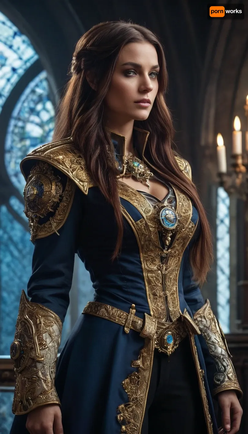 Beautiful female Rogue Trader from Warhammer 40k, tall and commanding with an aura of nobility and danger. Elegant yet battle-ready build, pale flawless skin, piercing eyes filled with ambition, long flowing hair styled regally, large bimbo breasts. Wearing ornate voidsuit or high gothic coat with gilded trim, decorated with purity seals, rosettes, and aquila insignia. Standing confidently on the bridge of a massive voidship. Surrounded by gothic starship architecture, stained glass, servo-skulls, cogitators, and banners of the Imperium. Ultra-realistic grimdark gothic sci-fi art, highly detailed, cinematic lighting, atmosphere of wealth, faith, and ruthless power.