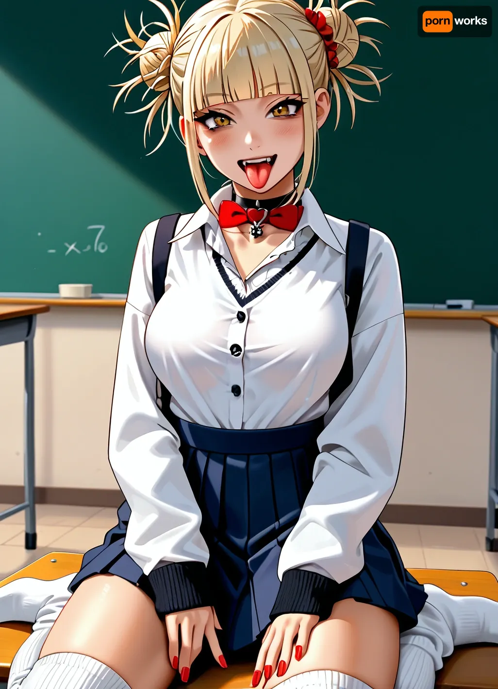((toga_himiko)), 1girl alternate_costume black_choker blonde_hair blue_skirt blunt_bangs breasts choker breasts_out clothes_around_waist collared_shirt double_bun gyaru hair_bun hand_on_own_chest kneeling large_breasts loose_socks open_clothes open_shirt pink_sweater red_nails scrunchie shirt short_bangs sidelocks skirt socks solo sweater sweater_around_waist tan tongue tongue_out v-shaped_eyebrows white_background, classroom, <lora:Basuke-P3v1-NbVp10:1.2>, <lora:hinaTuningFaceDetailer_SDXL-v2-rank256-pruned:1.2>