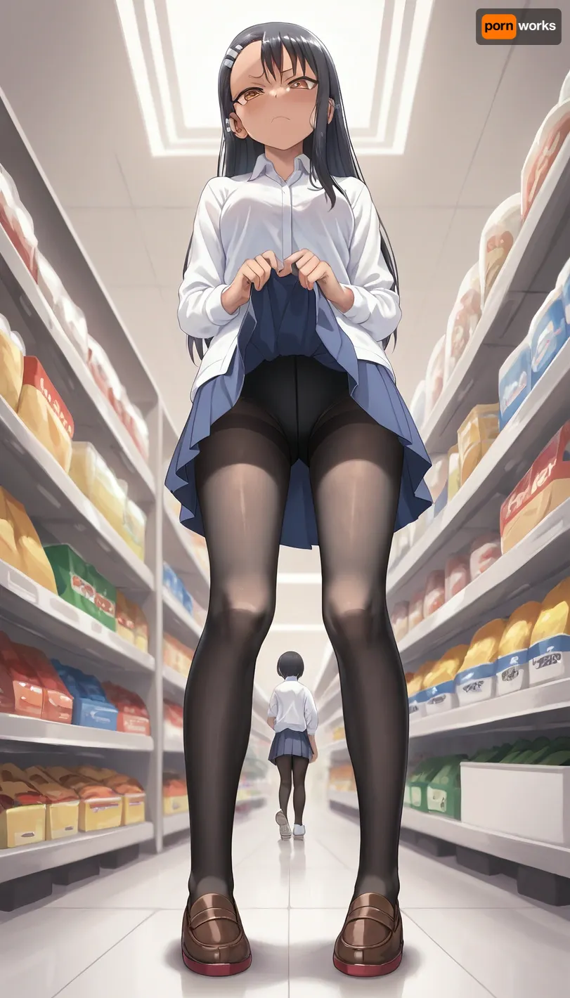 Nagatoro, Hayase Nagatoro, Surrender by man, view from below, from below, 1girl, solo, collared white shirt, buttoned jacket, pleated skirt, skirt lift, lifted by self, annoyed, black pantyhose, full body, in supermarket, <lora:skirt lift XL V2:.5>