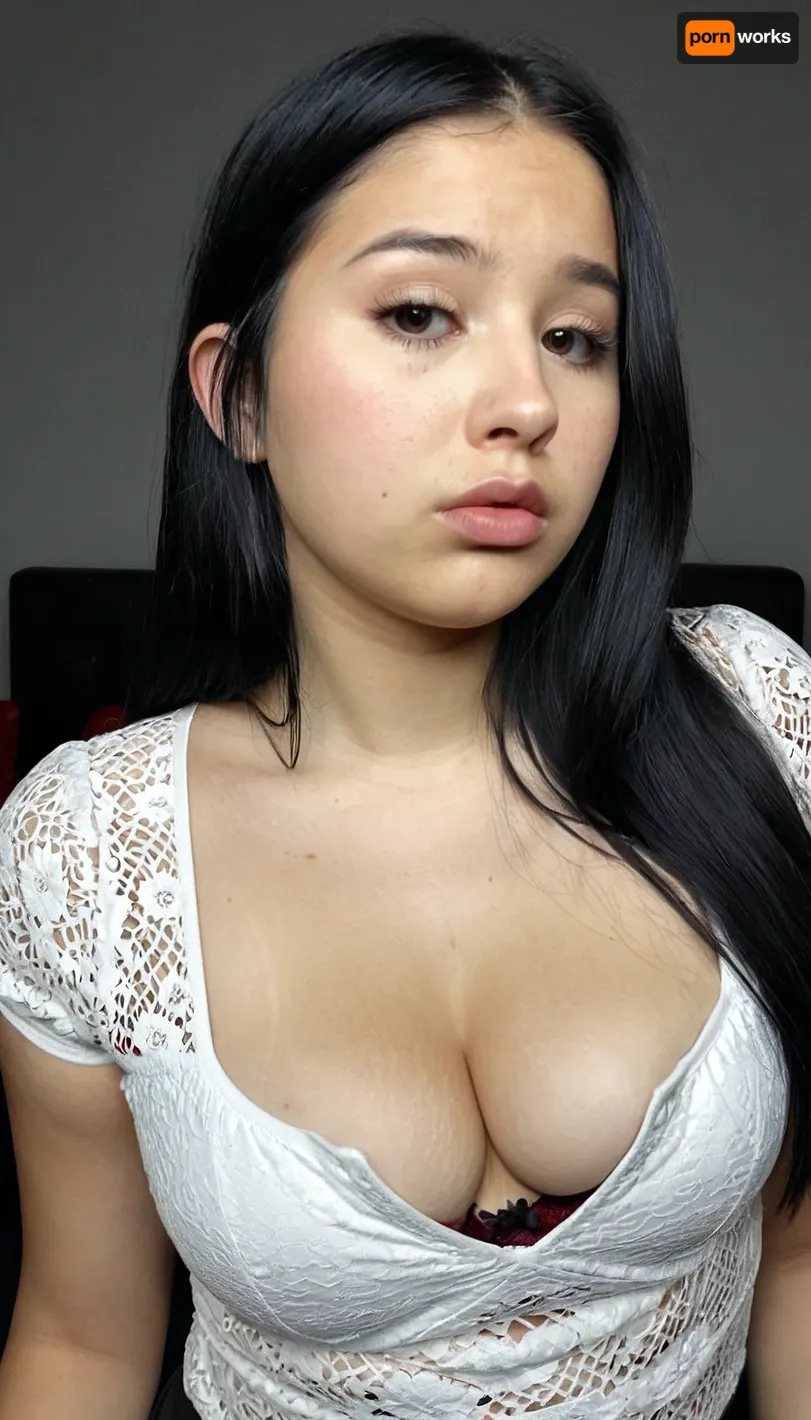 27 years old mexican woman, wearing blouse with cleavage, chubby, worried, small breasts, white skin, black hair, pretty face, straight hair, hyperrealistic photo, full hd, 8K
